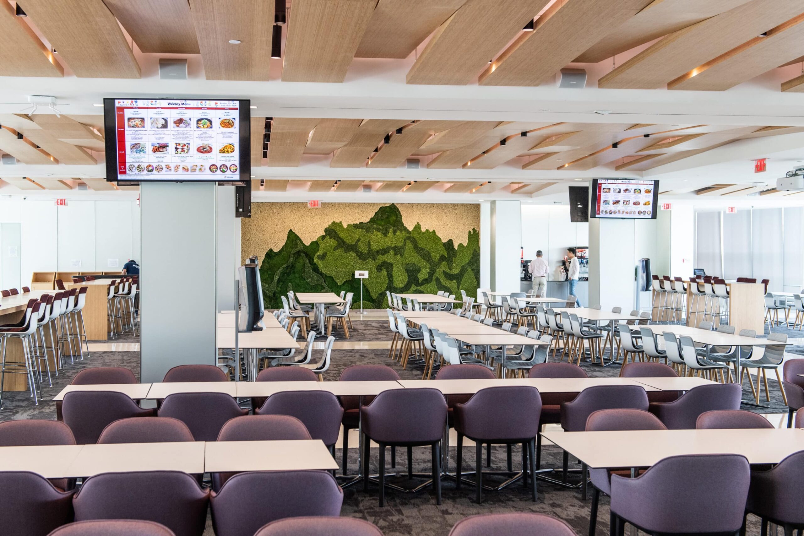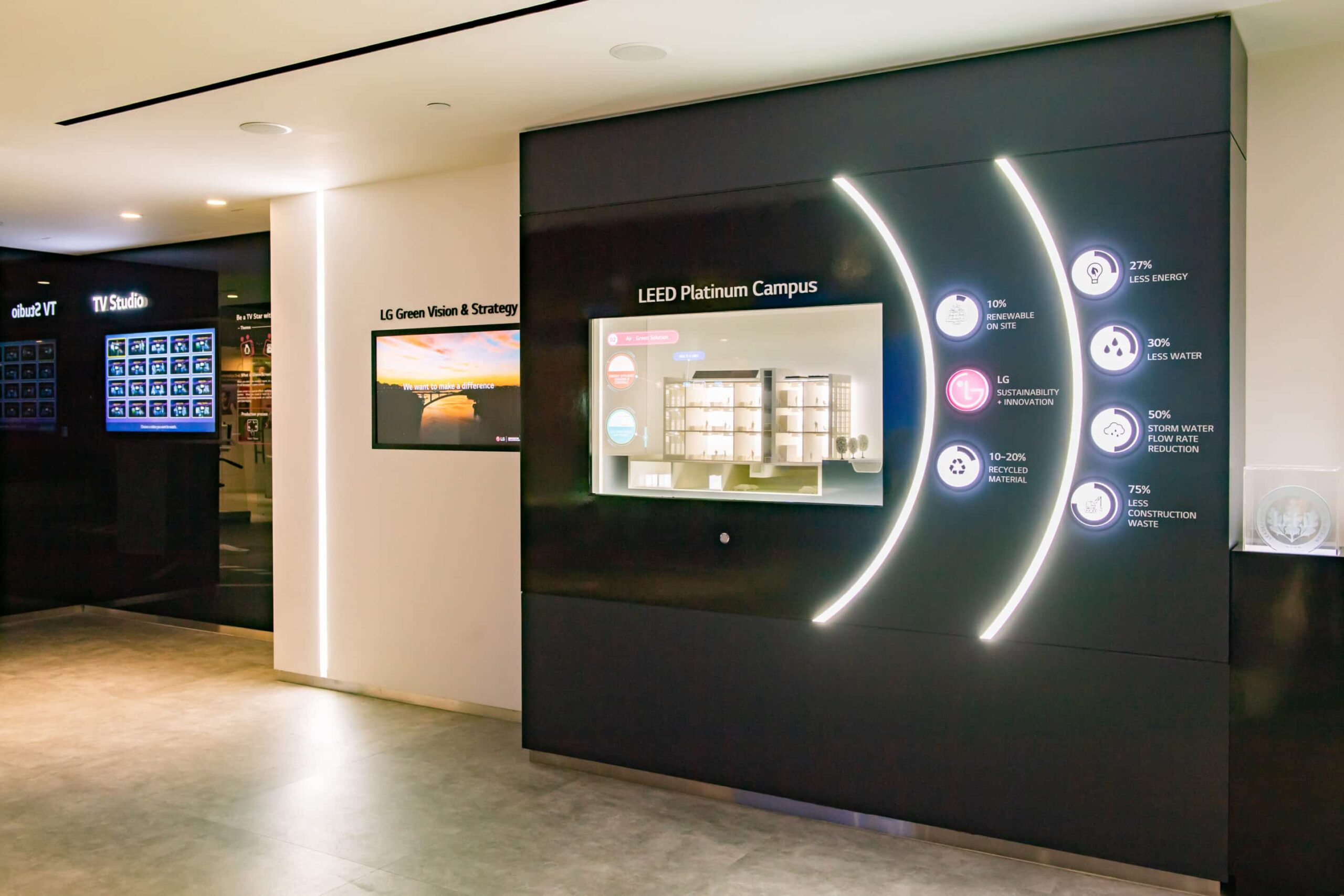 En plus de créer un environnement de travail convivial et facile à utiliser, LG souhaitait immerger ses employés dans ses technologies. AVI-SPL a installé des écrans OLED transparents, des écrans « Stretch » ultralarges, et 32 écrans OLED incurvés en cadre ouvert pour former un mur vidéo ondulé dans le laboratoire d’innovation de LG, ainsi que des écrans numériques de 75 pouces dans les « cafés de travail » en aire ouverte sur plusieurs étages. AVI-SPL a également intégré des murs vidéo en forme de L dans la cafétéria de LG et plus de quarante-cinq écrans d’affichage dynamique de 49 pouces servant de tableaux de menu. Ces écrans mettent en valeur les offres alimentaires et diffusent des nouvelles de l’entreprise.